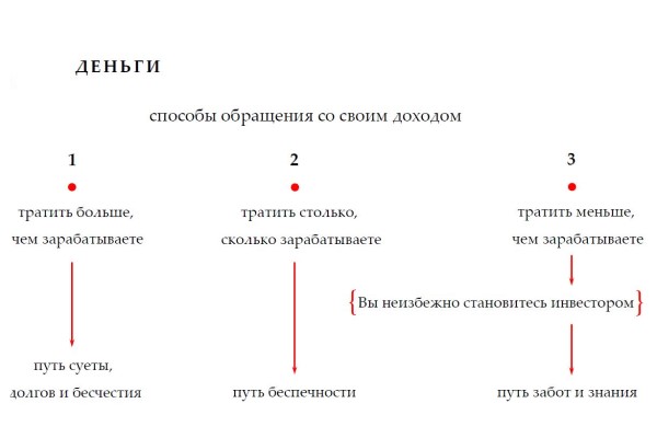 Первый важный шаг на пути к вашему будущему благосостоянию это работа по увеличению постоянных доходов и сокращению необоснованных расходов. Так, на начальном этапе каждому из нас следует приучить себя к простому разделению всех денежных поступлений на несколько небольших частей: