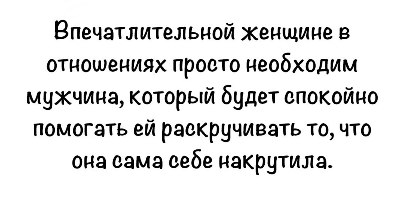 -Ты же красивая баба. Почему ты одна? Нашла бы себе нормального мужика. Хотя, что я говорю, что будет делать красивая баба с нормальным мужиком, красивой нужен ненормальный, чтобы то закидывал на небеса, то забывал поймать.